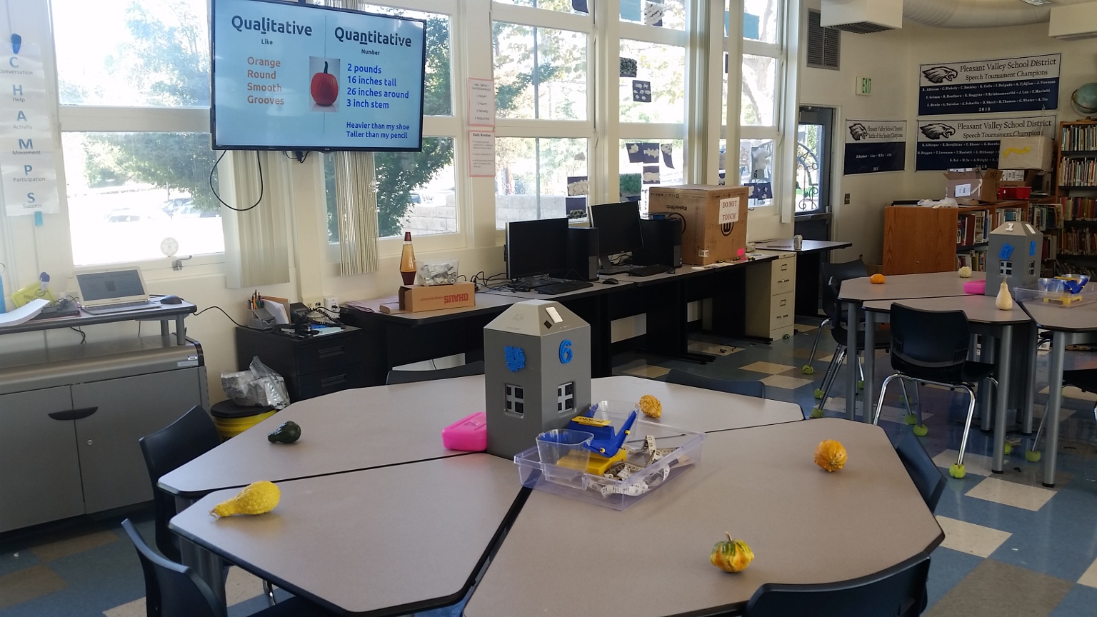 This is a much more structured lesson than many of my other elementary ones.  With this lesson, the students arrived in the STEM Lab to find a gourd at their seat.  As a scientific introduction, I did a brief explanation of taxonomy, starting with the examples of cats and lions and ending up with the gourd family.  I had the students think of characteristics that were similar between all members of this family based on their experience and many of the grade levels were able to make the connection to growing on vines, the outer rind, and the inner seeds.  From there, we did some guided discovery where I introduced the term Qualitative and had the students observe their gourd qualitatively.  The students answered in their mind as I led them through them using their senses to observe the gourd.  Example questions: “What shape is it?”,  “How does the skin feel?”, “How does the stem feel?”,  “What colors do you see?”,  “How many colors?”, “Does it make any sound when you shake it?”, etc.